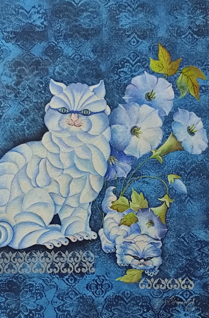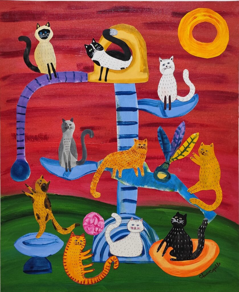 Coleção de estatuetas, poesias e cardes contanto a história e a biologia dos gatos, compostas com a pesquisa, inteligência artificial, desenho gráfico e muita imaginação.
